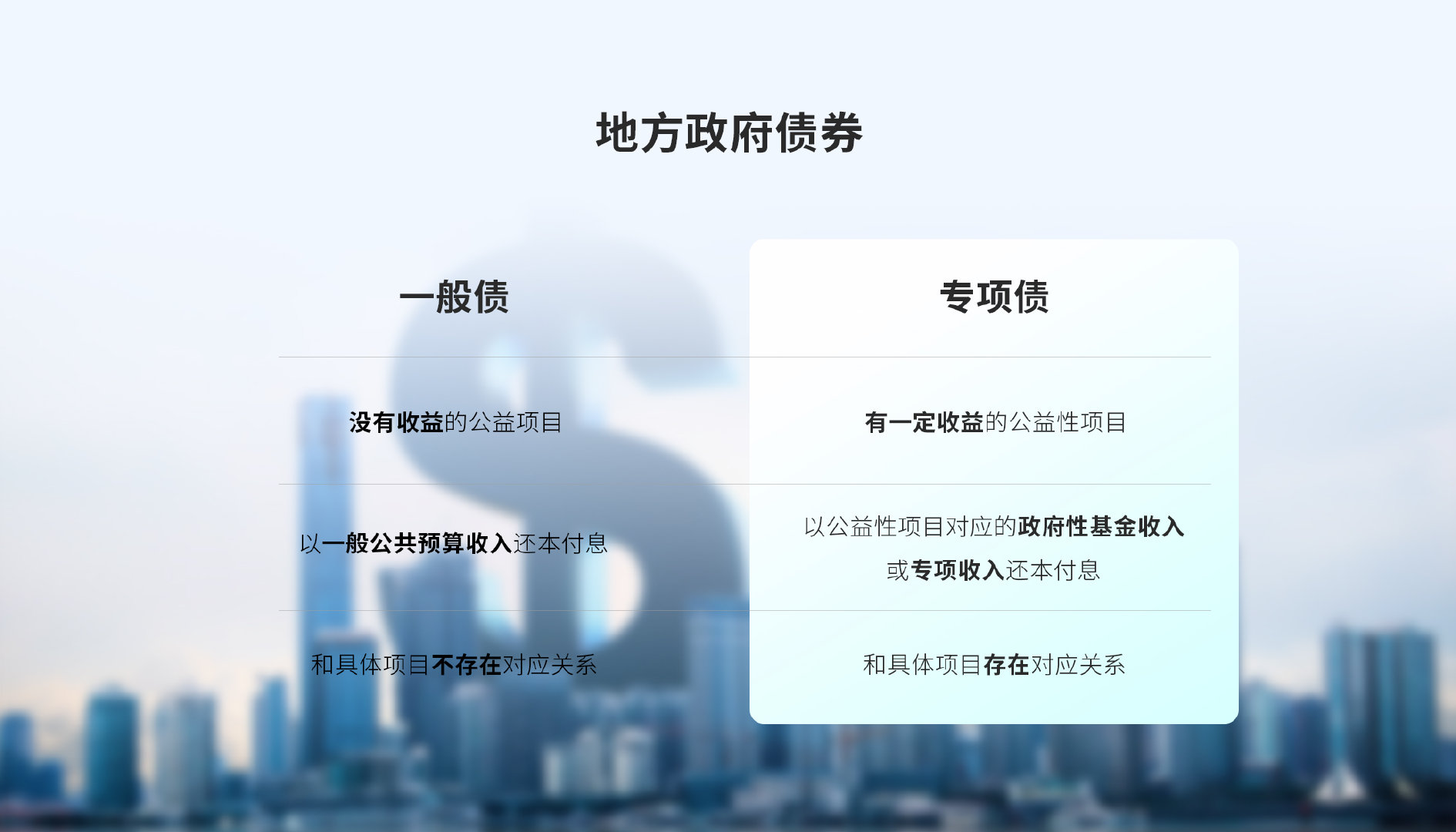 專項債是地方政府債券的兩大類之一。地方政府債券是省、自治區(qū)、直轄市和計劃單列市人民政府發(fā)行的,約定一定期限內(nèi)還本付息的政府債券,分為一般債和專項債。