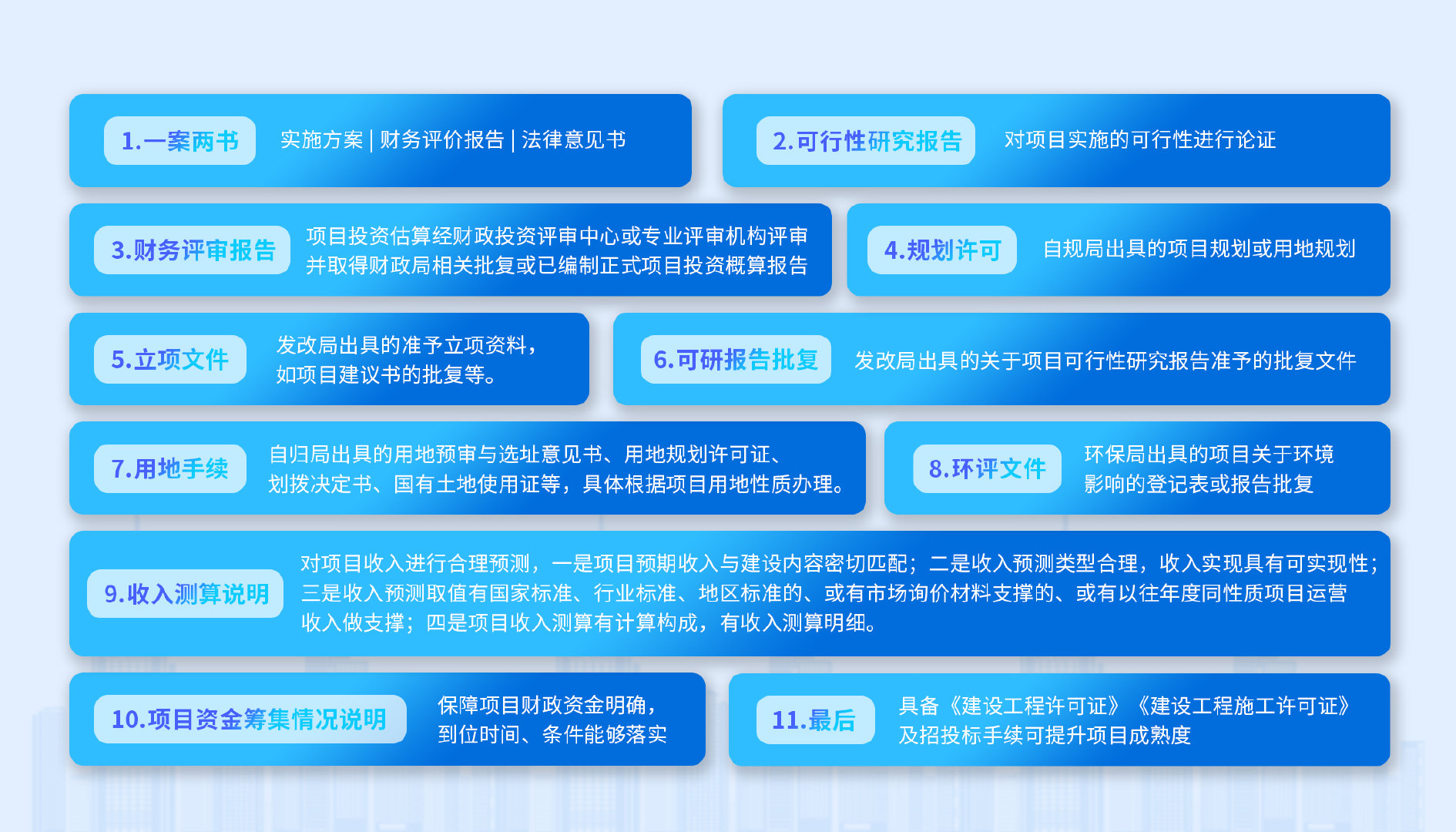 一是由專業(yè)機(jī)構(gòu)撰寫的項目實施方案(具體包括項目概況、投資測算、收益測算、平衡分析和測算附表),切忌方案強(qiáng)行平衡;