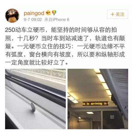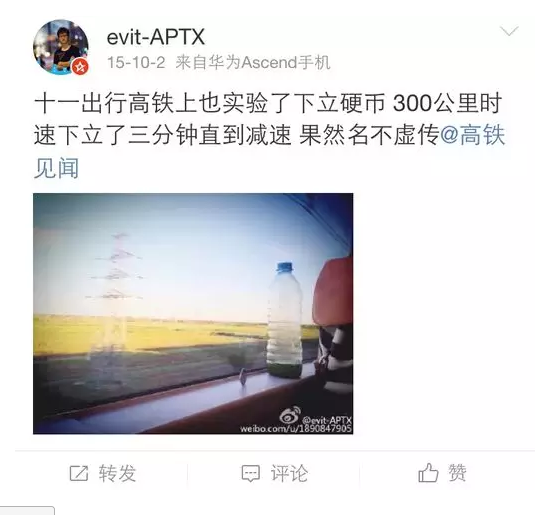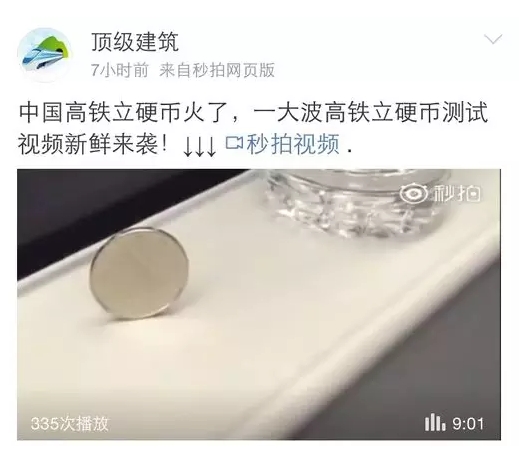 各路中國網(wǎng)友開始踴躍證明,用一元硬幣在高鐵上做起了立硬幣實驗(一元人民幣厚度是1.85毫米),結果硬幣依然傲然挺立,表示毫無壓力。