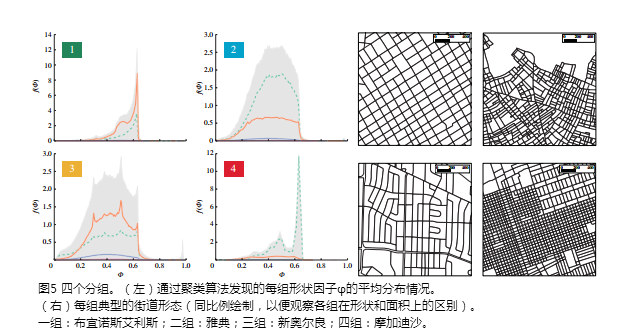 他們將那些城市地塊的尺寸、形狀繪制出來(lái):有些城市的地塊形狀統(tǒng)一;另一些則有更多小型、曲線(xiàn)圍成的地塊。他們比較了地塊的不同分布,將眾多城市劃入四個(gè)不同“組別”:
