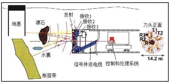 在盾構(gòu)機或TBM上安裝超前地質(zhì)預(yù)報設(shè)備,一直是機械開挖的目標和方向,但目前的盾構(gòu)機和TBM基本上還沒有這方面的設(shè)備。日本一些學(xué)者,做過一些SSP(Sonic Soft Ground Probing)聲波前方預(yù)報的試驗工作(見下圖),但目前仍沒有更深入的研究成果和更成熟的經(jīng)驗。