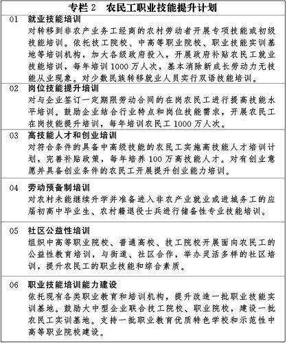 加強(qiáng)農(nóng)民工職業(yè)技能培訓(xùn),提高就業(yè)創(chuàng)業(yè)能力和職業(yè)素質(zhì)。整合職業(yè)教育和培訓(xùn)資源,全面提供政府補(bǔ)貼職業(yè)技能培訓(xùn)服務(wù)。強(qiáng)化企業(yè)開展農(nóng)民工崗位技能培訓(xùn)責(zé)任,足額提取并合理使用職工教育培訓(xùn)經(jīng)費(fèi)。鼓勵高等學(xué)校、各類職業(yè)院校和培訓(xùn)機(jī)構(gòu)積極開展職業(yè)教育和技能培訓(xùn),推進(jìn)職業(yè)技能實訓(xùn)基地建設(shè)。鼓勵農(nóng)民工取得職業(yè)資格證書和專項職業(yè)能力證書,并按規(guī)定給予職業(yè)技能鑒定補(bǔ)貼。加大農(nóng)民工創(chuàng)業(yè)政策扶持力度,健全農(nóng)民工勞動權(quán)益保護(hù)機(jī)制。實現(xiàn)就業(yè)信息全國聯(lián)網(wǎng),為農(nóng)民工提供免費(fèi)的就業(yè)信息和政策咨詢。