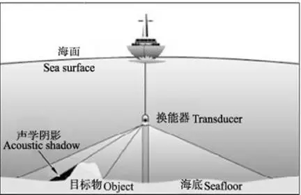 側(cè)掃聲納是利用專用的探頭發(fā)射聲納信號。聲納探頭發(fā)出的信號呈扇形向下傳播,扇形在水平角方向為0.6°~1.9°,而在垂直角方向為32°,當聲納信號到達江底時,就會產(chǎn)生反射和散射。接收器接收來自江底的返回聲納,儀器設備根據(jù)接收到的聲納信號的時間及角度,經(jīng)過計算機處理就可以描繪出該扇形區(qū)域江底的相對深度變化,從而得到江底的地貌起伏情況和存在江底(海底)的沉船及其它近表面的物體等的具體位置、形態(tài)和尺寸。