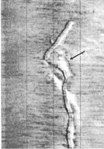 本實例為上海京海工程技術公司上級單位中國地質(zhì)科學院物化探研究所采用側(cè)掃聲納探測得到的資料。圖5是一段裸露于海底面上的電纜的側(cè)掃聲納圖像。該電纜為多年前采用水力噴射埋設方式鋪設,但是由于鋪設時未能準確的將該電纜放入噴射出的溝槽內(nèi),從而導致該電纜露在海底面上。