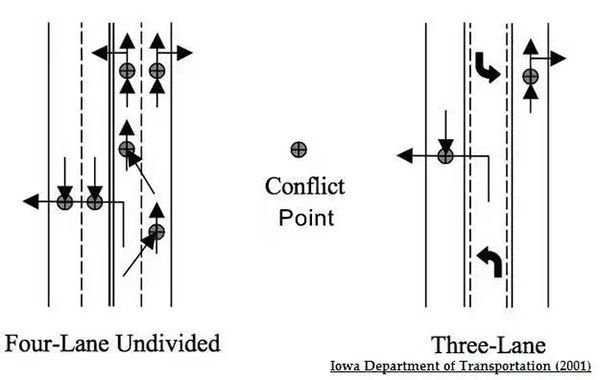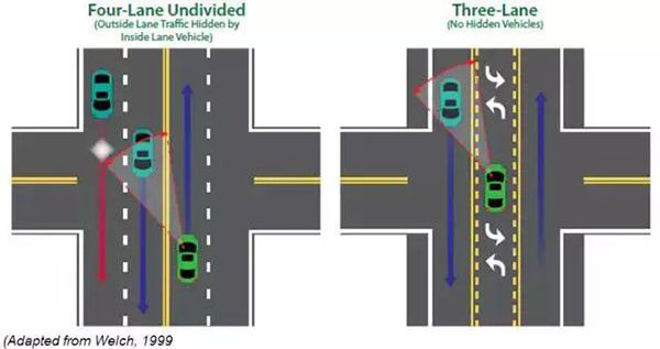 在美國(guó),道路瘦身的形式是將傳統(tǒng)的雙向四車道改造為帶有中央左轉(zhuǎn)專用道的三車道道路,當(dāng)然還可以通過(guò)三車道改造為兩車道、自行車道改造為隔離式(受保護(hù))的自行車專用道、減少寬街道的車道寬度等方式進(jìn)行「道路瘦身」工程。