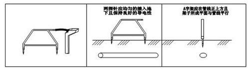 5、管線的對地泄漏電流可由“A”字架兩腳分別接收,而接收機(jī)顯示的信號大小則是兩針接收信號的差值,當(dāng)兩針接收的差值為零時,則說明“A”字架在故障點的正上方