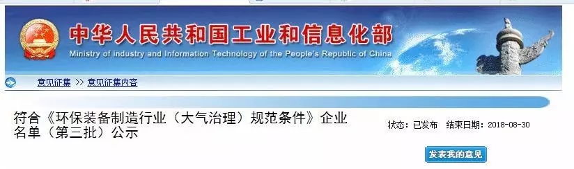 為落實《工業和信息化部關于加快推進環保裝備制造業發展的指導意見》,引導生產要素向優勢企業集聚,促進大氣治理裝備制造業高質量發展,根據《環保裝備制造行業(大氣治理)規范條件》(2016年第66號公告)要求,現將擬公告的符合《環保裝備制造行業(大氣治理)規范條件》企業名單(第三批)予以公示。如有異議,請在公示期間內與我們聯系,并提交相關證明材料。
