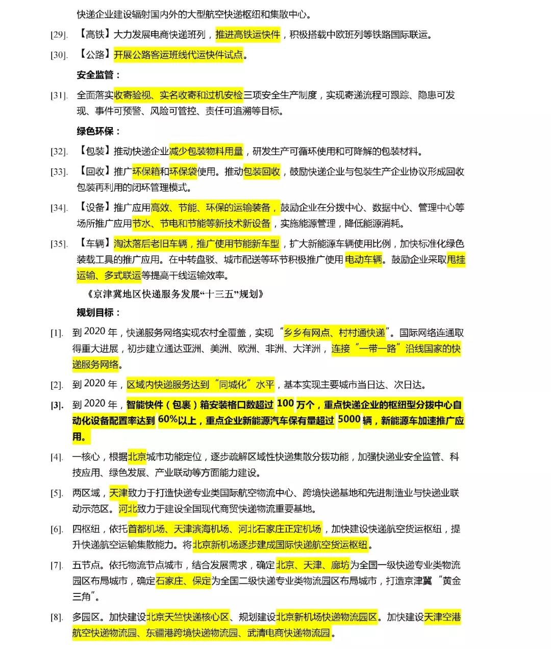 (3)到2020年,京津翼地區(qū),智能快件(包裹)箱安裝格口數超過100萬個,重點快遞企業(yè)的樞紐型分撥中心自動化設備配置率達到60%以上,重點企業(yè)新能源汽車保有量超過5000輛,新能源車加速推廣應用。