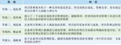 設(shè)計(jì)院向工程公司轉(zhuǎn)型升級(jí),需要提升管理能力,如項(xiàng)目管理能力、商務(wù)和法律能力、專業(yè)采購(gòu)和分包管理能力、信息化建設(shè)和運(yùn)用能力等,這都是擺在傳統(tǒng)設(shè)計(jì)院面前的新課題。特別是項(xiàng)目管理能力的打造,是能否實(shí)現(xiàn)轉(zhuǎn)型的關(guān)鍵,只有真正具備了較為完善的項(xiàng)目管理能力,企業(yè)才能以工程公司模式順暢運(yùn)作。根據(jù)項(xiàng)目管理理論,企業(yè)的項(xiàng)目管理能力可分為5個(gè)等級(jí),見表1。