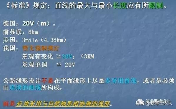公路線形應與地形相適應,與景觀相協調,直線的最大長度應有所限制,當采用長的直線線形時,為彌補景觀單調的缺陷,應結合具體情況采取相應的技術措施。