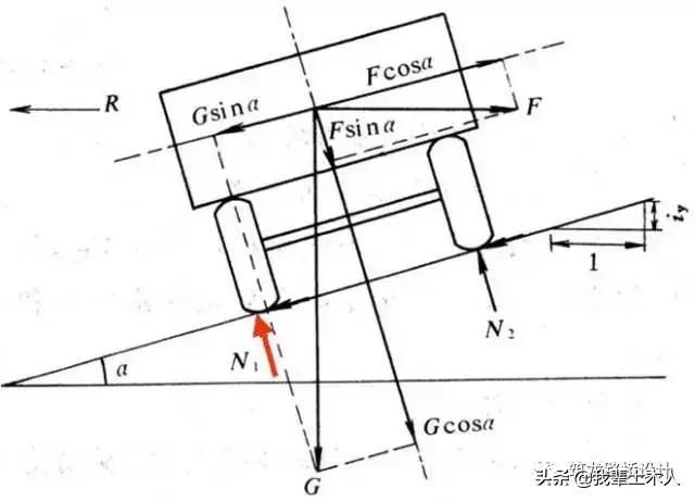 由于路面橫向傾角α一般很小,則sinα≈tgα=ih,cosα≈1,其中ih稱為橫向超高坡度,
