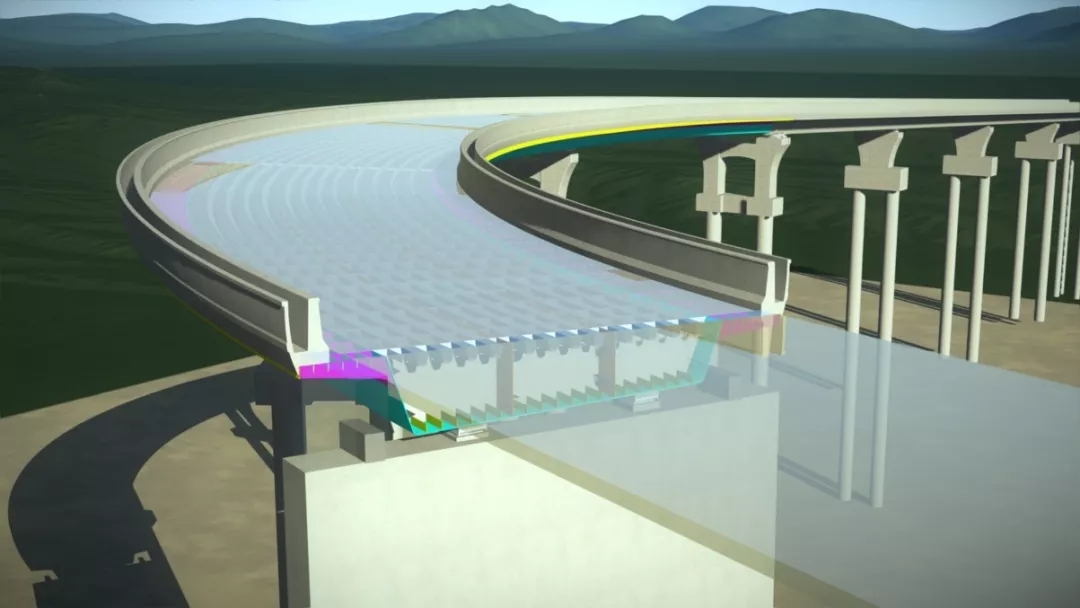 道路BIM正向設計。項目互通立交密集,設計難度大。項目組創新性地研發了道路工程BIM正向設計軟件CNCCBIM OpenRoads。該軟件基于精準的三維基礎環境,結合項目實際,定制了符合我國規范要求的參數化橫斷面模板,通過參數化技術快速完成道路BIM設計,創建精準的道路BIM信息模型,并基于BIM模型剖切實現了道路工程二維圖紙和報表的自動生成,模型與圖紙實時關聯,確保了圖紙與模型的一致和準確性,滿足了行業交付要求。