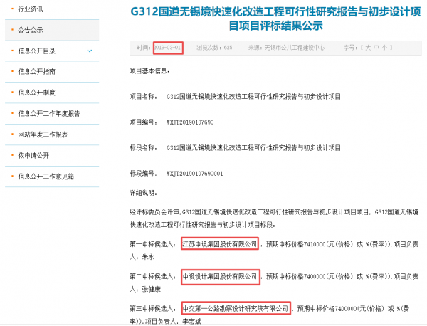 今年3月1日,無(wú)錫市城市重點(diǎn)項(xiàng)目管理中心發(fā)布的《G312國(guó)道無(wú)錫境快速化改造工程可行性研究報(bào)告與初步設(shè)計(jì)項(xiàng)目項(xiàng)目評(píng)標(biāo)結(jié)果公示》顯示,該項(xiàng)目標(biāo)段的第一中標(biāo)候選人為中設(shè)股份,第二中標(biāo)候選人為中設(shè)集團(tuán),第三中標(biāo)候選人為中交第一公路勘察設(shè)計(jì)研究院有限公司。
