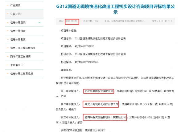 此外,無(wú)錫市城市重點(diǎn)項(xiàng)目管理中心于今年8月23日發(fā)布的《G312國(guó)道無(wú)錫境快速化改造工程初步設(shè)計(jì)咨詢項(xiàng)目評(píng)標(biāo)結(jié)果公示》顯示,該項(xiàng)目標(biāo)段的第一中標(biāo)候選人為蘇交科、第二中標(biāo)候選人為中交公路規(guī)劃設(shè)計(jì)院有限公司、第三中標(biāo)候選人為招商局重慶科研設(shè)計(jì)研究院有限公司。