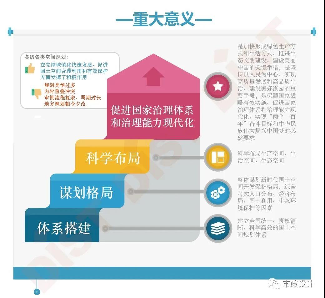但隨著機構改革,2018年3月自然資源部正式掛牌成立,住建部規劃事權易主,空間規劃一統天下。空間規劃改革的目的是為了構建以生態文明為導向、高質量發展的空間治理模式。對促進國家治理體系和治理能力現代化、科學布局、謀劃格局和體系搭建都具有重大意義,同時也強化了國土空間規劃對各專項規劃的指導約束作用。