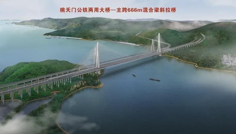 ,均為公鐵兩用,在同一平面布置了雙線鐵路及雙向六車道高速公路。其中,西堠門大橋采用斜拉懸索協作體系,主跨達1488米,建成后將是世界同類工程中跨度最大的公鐵合建橋梁;桃夭門大橋為分離式混合梁斜拉橋,主跨達666米。