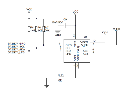 射頻閱讀器和識(shí)別器的核心在于RFID芯片。通常RFID芯片供電電壓1.8V-5.5V,帶有4K、16K或64K的E2PROM,通過(guò)片內(nèi)串行總線I2C或者射頻進(jìn)行數(shù)據(jù)傳輸。圖2為RFID芯片ST25的識(shí)別器電路原理圖。射頻識(shí)別芯片通過(guò)SCL和SDA和主控制器芯片完成通訊。控制器再和上位機(jī)完成信息交換傳輸。