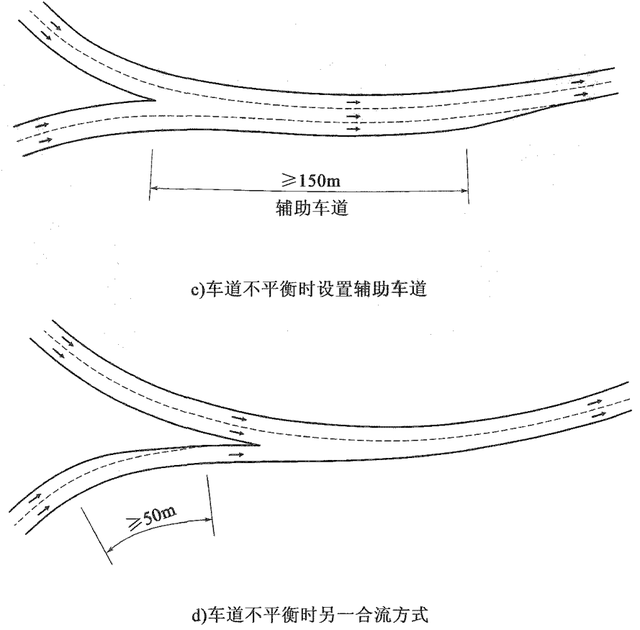 合流原則上,與分流相逆。依據(jù)交通量大小,按車道數(shù)和通行能力平衡的原則: