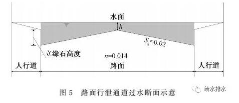 輸水能力計(jì)算圖5為路面行泄通道過水?dāng)嗝媸疽狻3鲇谟?jì)算簡化起見,不考慮道路中央分隔帶和機(jī)非隔離帶對過水?dāng)嗝娴挠绊懀膊豢紤]超出道路機(jī)動車道和非機(jī)動車道范圍內(nèi)的過水?dāng)嗝妗8鶕?jù)表2中規(guī)定,至少一條機(jī)動車道積水不能超過15 cm,假設(shè)機(jī)動車道寬度為3.5 m,則圖5中道路中央積水深度h=0.15-3.5×0.02=0.08(m)。