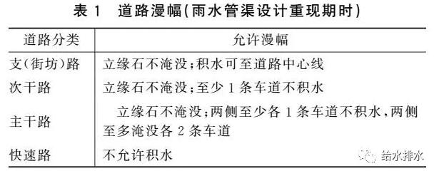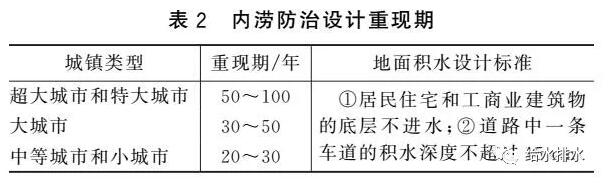 《Urban Storm Drainage Criteria Manual》對于內(nèi)澇防治設(shè)計(jì)重現(xiàn)期時的道路積水有詳細(xì)規(guī)定,我國《室外排水設(shè)計(jì)規(guī)范》有類似規(guī)定,見表2。