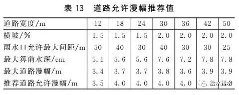 我國尚無明確的道路漫幅規(guī)定,建議有關(guān)部門盡快制定相關(guān)的標(biāo)準(zhǔn)。在相關(guān)標(biāo)準(zhǔn)未出臺前,設(shè)計(jì)人員計(jì)算時采用的道路漫幅可參考表13推薦值。