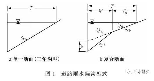 道路雨水偏溝主要有2種型式:單一斷面和復(fù)合斷面(見圖1)。出于計(jì)算簡便的需要,僅介紹單一斷面(三角溝型)的計(jì)算方法。