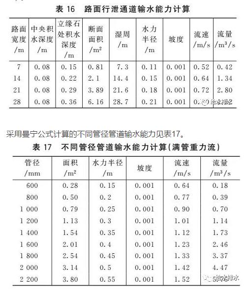 采用曼寧公式計(jì)算的路面行泄通道輸水能力見表16(假設(shè)機(jī)動車和非機(jī)動車道寬度均為3.5 m)。