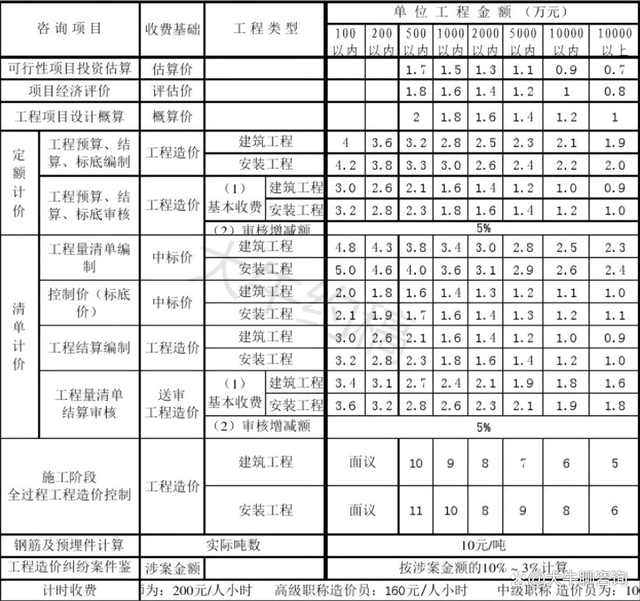 一、上表收費按差額定率分檔累進法計費。劃分標準為單項工程。當咨詢收費不足2000元時,按2000元收?。?/span>