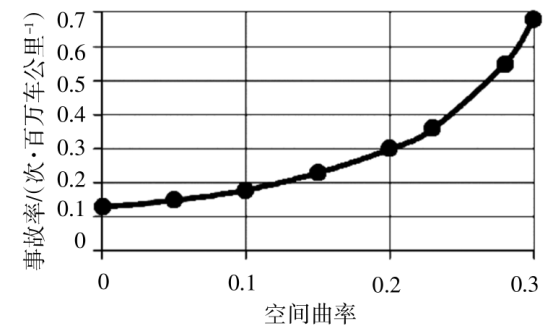 在開展公路路線設計安全性評價中,為了提高設計的合理性,還要構建完善的系統分析和評價模型,主要包括行車安全事故發生概率與空間曲率指標模型的評價。及時通告公路實際情況,結合現代公路安全角度進行評價,明確公路線路設計項目的完整性搜集,同時構建完善的模型曲線關系,相關專業人士的空間曲率和安全事故發生率直接的曲線關系如圖1所示。