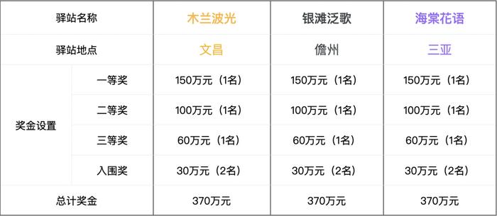 每個(gè)驛站分別設(shè)置一、二、三等獎(jiǎng)及入圍獎(jiǎng),總獎(jiǎng)金池達(dá)1,110萬元(稅前)。獎(jiǎng)金情況公示如下:
