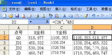 在實際工作中路線導線的坐標數(shù)據(jù)都是用Excel 表格存放。這樣簡化了在繪圖時輸入坐標的麻煩,在Excel表格中編輯導線點坐標對,如圖11-2 所示,選中D2 欄,輸入公式“C2&" ,"&B2”,按回車鍵,系統(tǒng)自動生成了所需要的坐標對。選中 D2欄,將光標指向第二欄右下角,系統(tǒng)出現(xiàn)黑色小十字標記,按住鼠標左鍵向下拖動十字標記,一直到ZD,D2欄就自動生成了對調后的各交點的坐標對,并將他們依次復制下來。
