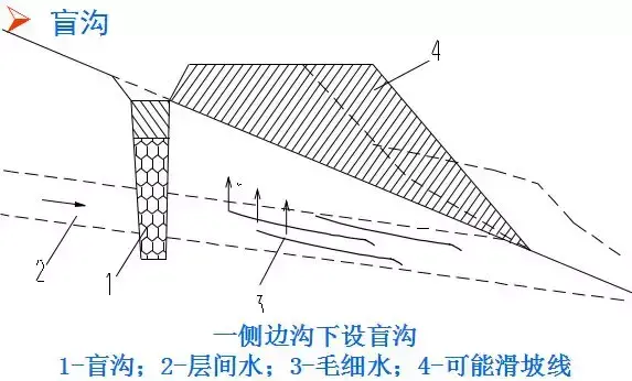8.滲溝:利用滲透方式匯集流向路基的地下水,并通過溝底通道將水排至指定的地點,起到降低地下水位或攔截地下水。