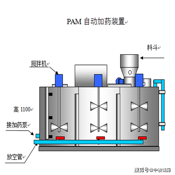 生產采用的干粉絮凝劑為每袋 25kg 的有機高分子助凝劑?,F場根據干粉稀釋濃度要求、加藥箱的容積、計量泵排量、每天加藥量,合理確定了外輸量、干粉加藥濃度等參數。