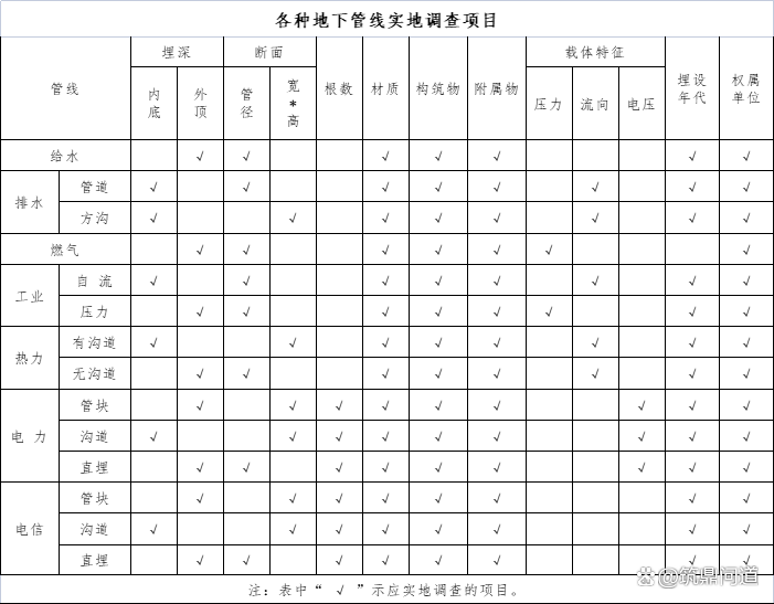 地下管線調查項目有地下管線的平面位置、埋深(或高程)、流向、壓力以及管線規(guī)格、性質、材料、權屬等屬性。