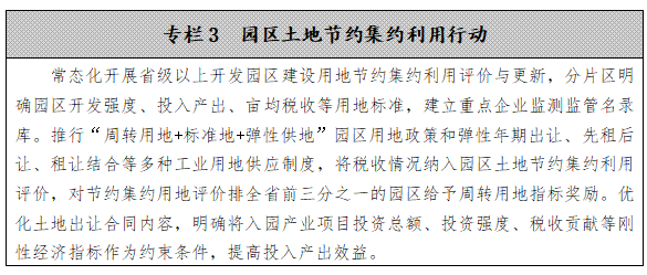 嚴(yán)格控制新增建設(shè)用地。發(fā)揮成片開發(fā)政策和計劃調(diào)節(jié)作用,科學(xué)核定城鎮(zhèn)新增建設(shè)用地規(guī)模,逐步減少農(nóng)村建設(shè)用地規(guī)模,有效控制新城新區(qū)和開發(fā)區(qū)無序擴(kuò)張。在省級以上開發(fā)園區(qū)繼續(xù)開展“標(biāo)準(zhǔn)地+承諾制”改革試點(diǎn),建立土地精細(xì)化供應(yīng)管理體系,服務(wù)“五好”園區(qū)建設(shè)。強(qiáng)化土地開發(fā)強(qiáng)度剛性約束,分行業(yè)制定產(chǎn)業(yè)項目用地投入產(chǎn)出強(qiáng)度指導(dǎo)標(biāo)準(zhǔn),推進(jìn)以地控稅、以稅節(jié)地、“畝均效益”綜合評價,落實單位GDP建設(shè)用地使用面積下降率的控制要求。完善“承諾供地時間+逾期公告撤批”制度,堅決防止新增批而未供土地。