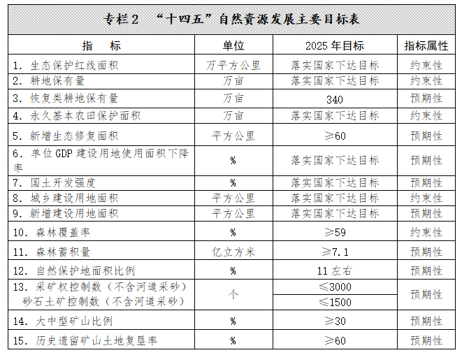 ——自然資源節(jié)約集約利用水平明顯提升。資源總量管理、科學(xué)配置、全面節(jié)約、循環(huán)利用的模式和管控體系基本建立,單位GDP建設(shè)用地使用面積下降率達(dá)到國家下達(dá)目標(biāo),大中型礦山比例達(dá)到30%以上。