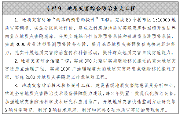 實施地質(zhì)災(zāi)害技防建設(shè)工程。推進(jìn)省市縣三級地質(zhì)災(zāi)害防治技術(shù)裝備保障能力建設(shè),配置空天地一體化數(shù)據(jù)采集、傳輸、通訊、指揮等防治現(xiàn)代化專業(yè)裝備,提升地質(zhì)災(zāi)害防治信息獲取、通信保障、數(shù)據(jù)分析和技術(shù)支撐能力。為群測群防員配備升級基礎(chǔ)性裝備。